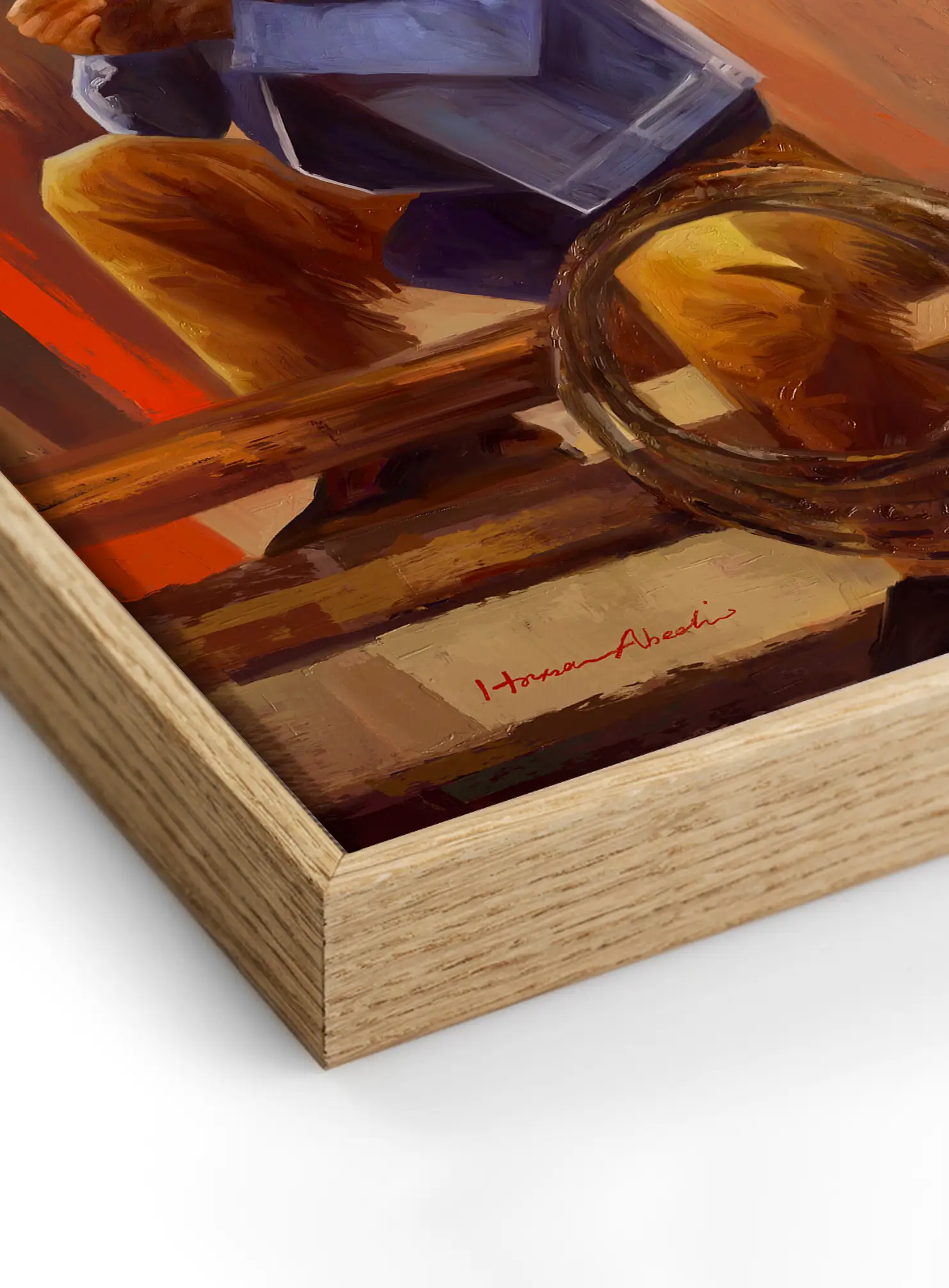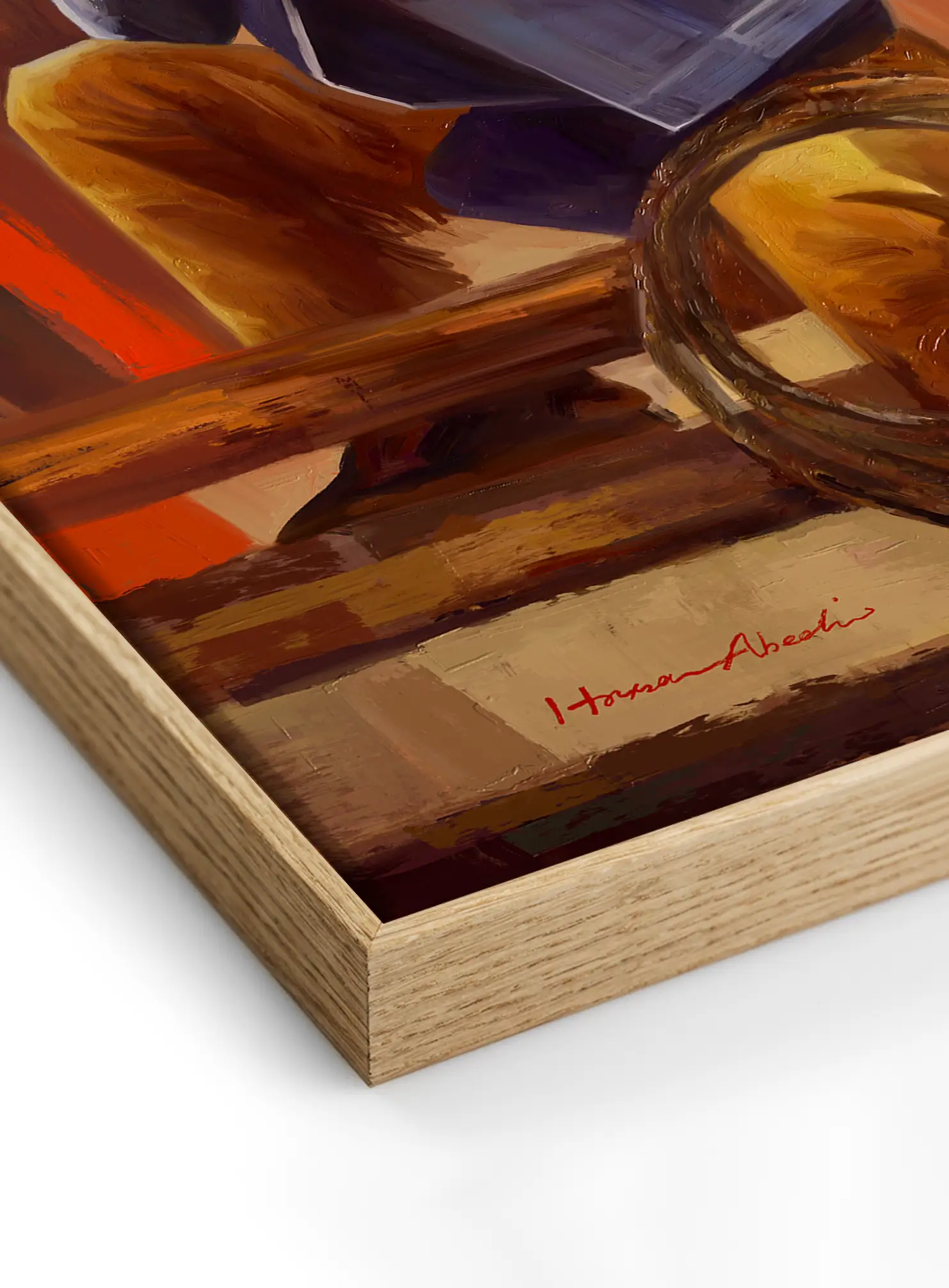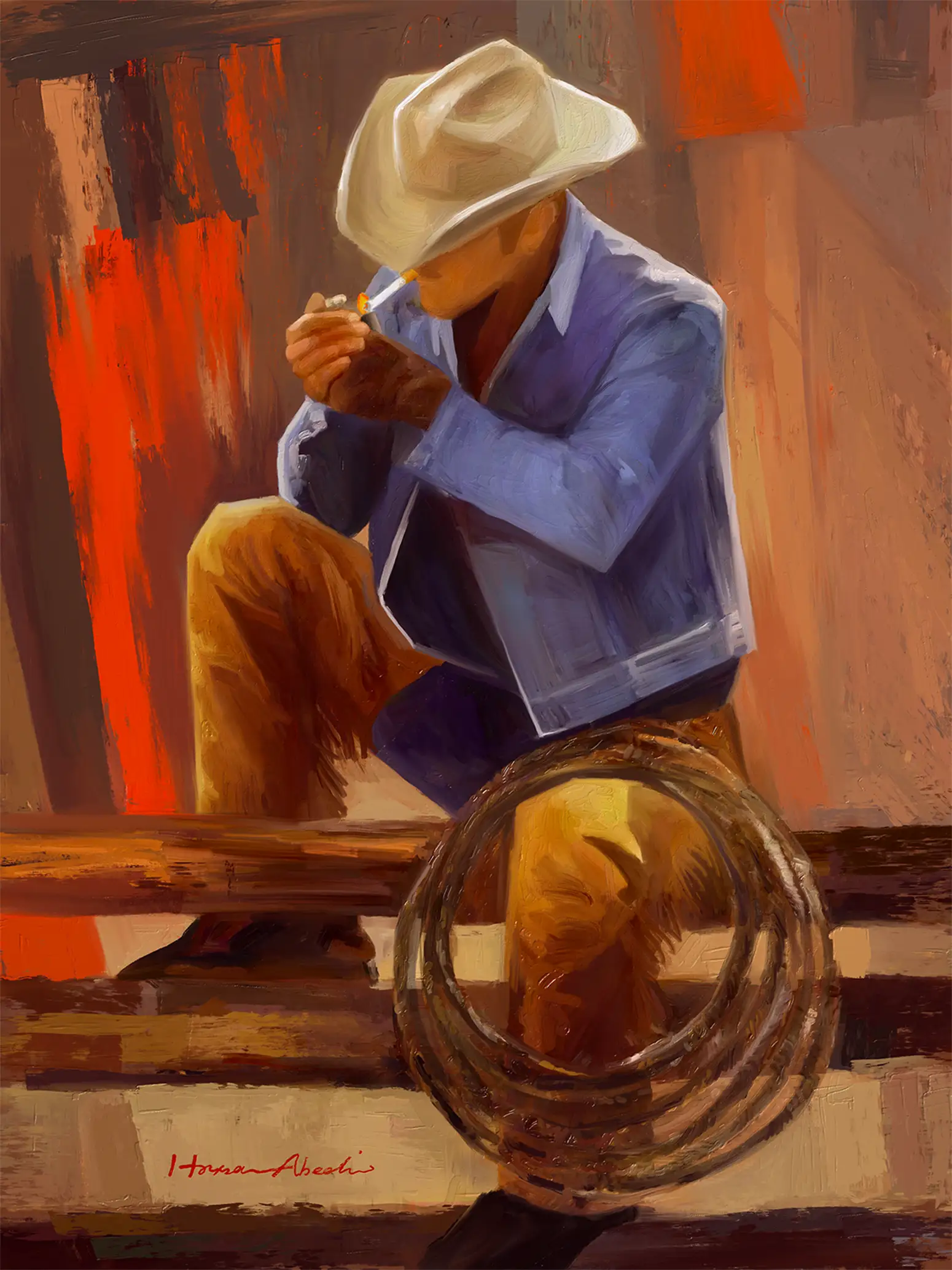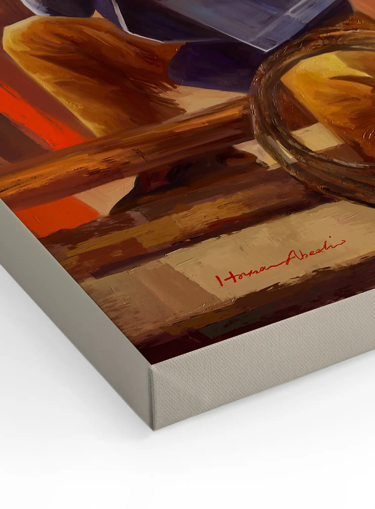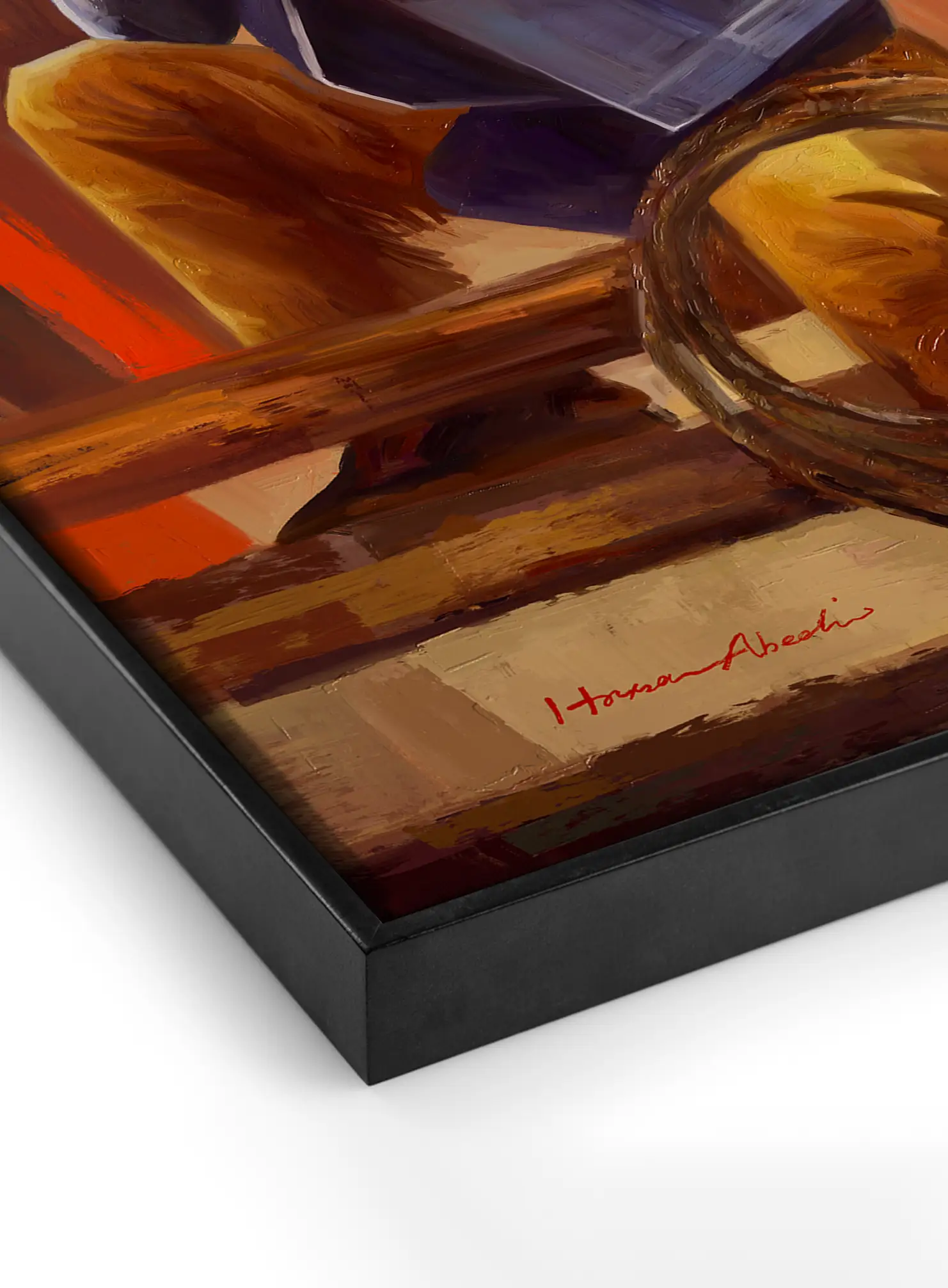 در این تابلو از ترکیب رنگی گرم استفاده شده است، مضمون تابلو جایست که حس درونگرایی و تامل را میتوان احساس کرد، انسانی میان کار و خلوت خود.