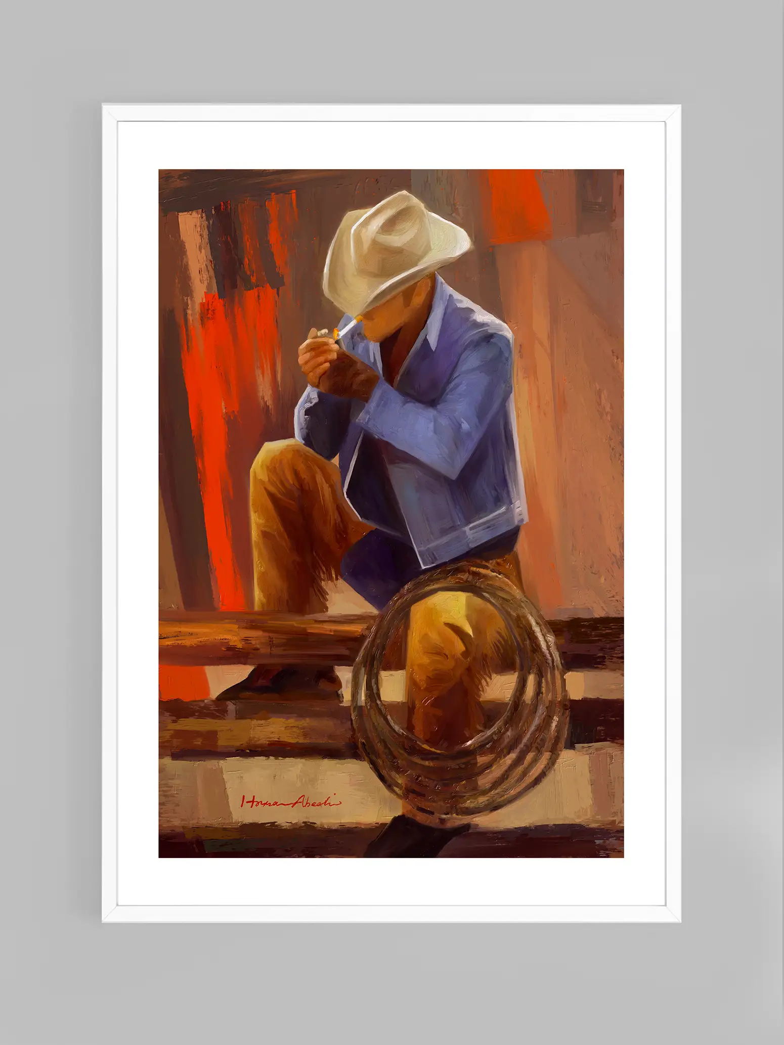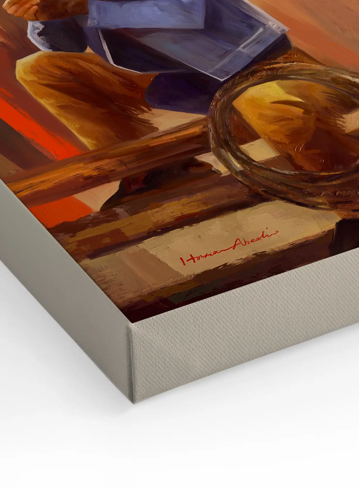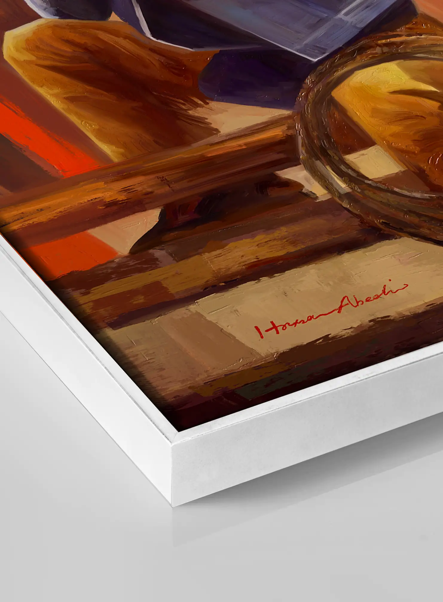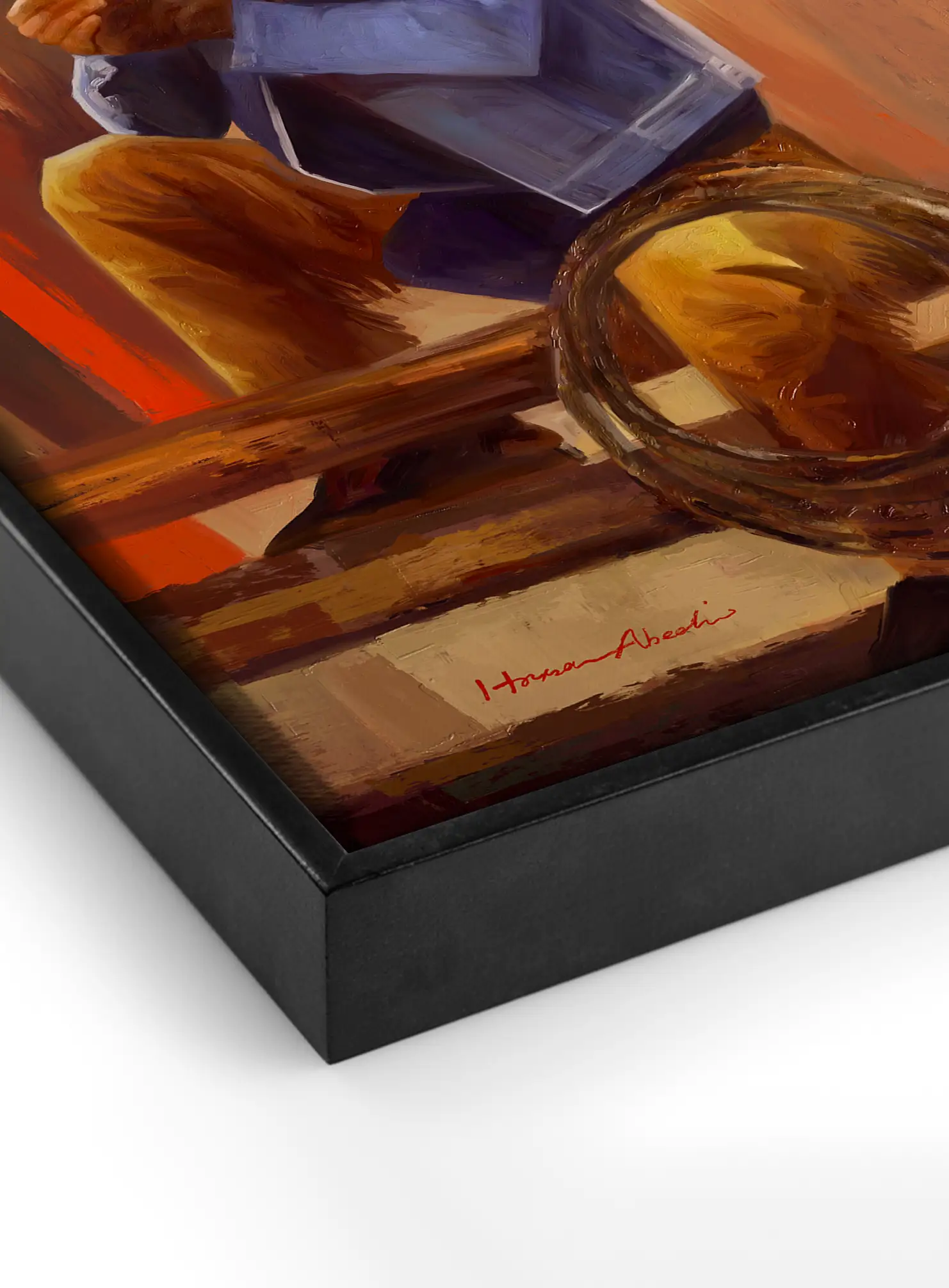 در این تابلو از ترکیب رنگی گرم استفاده شده است، مضمون تابلو جایست که حس درونگرایی و تامل را میتوان احساس کرد، انسانی میان کار و خلوت خود.